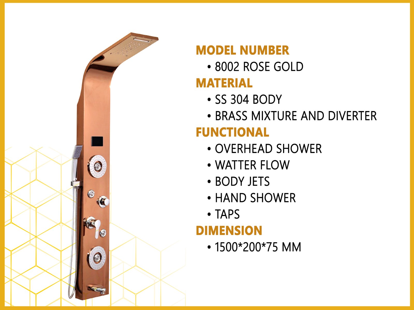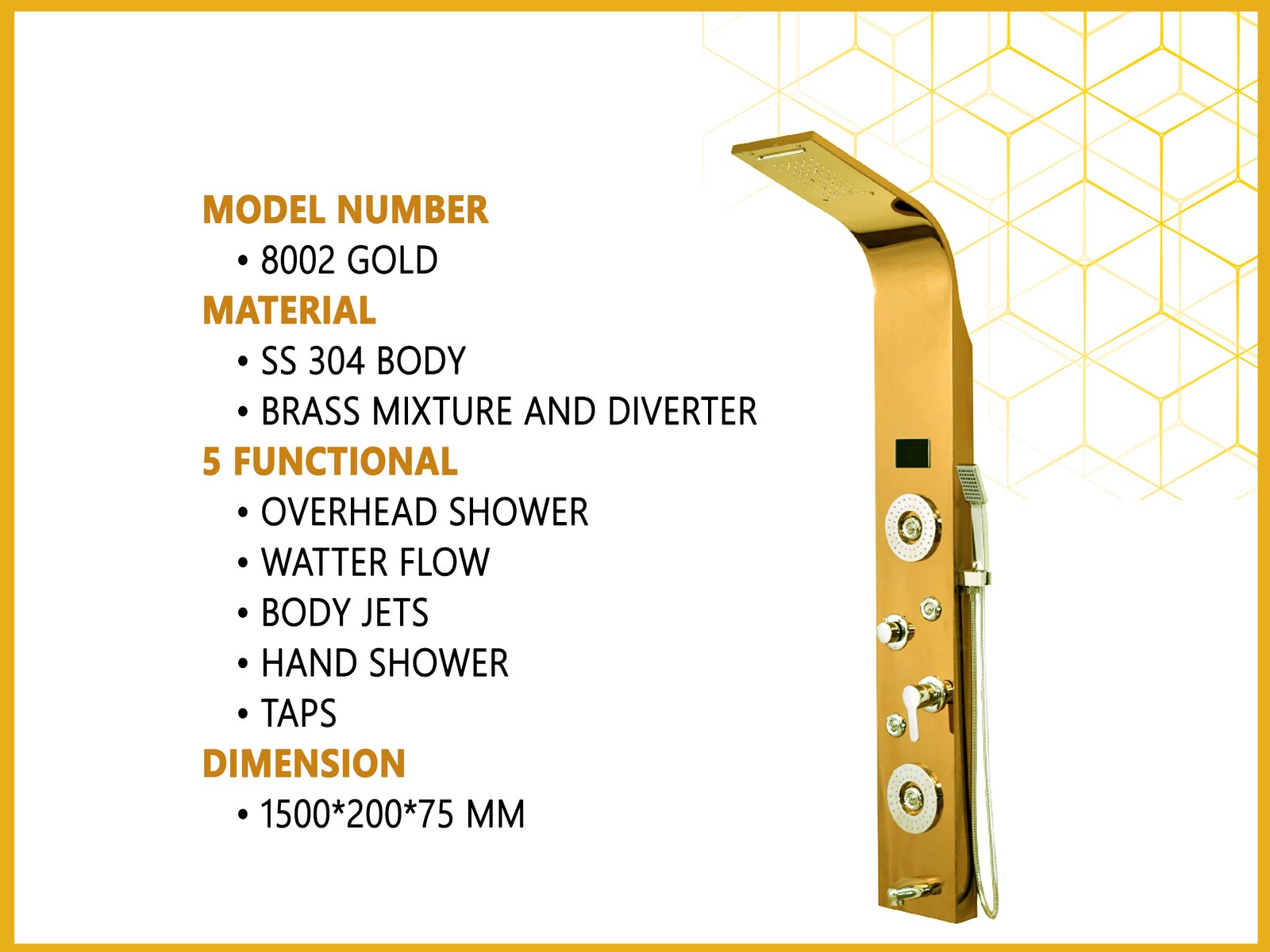 Multi-Function System: Includes a large rainfall top shower, waterfall spout, 5 hydro body jets, a flexible handheld shower, and a convenient tub spout.